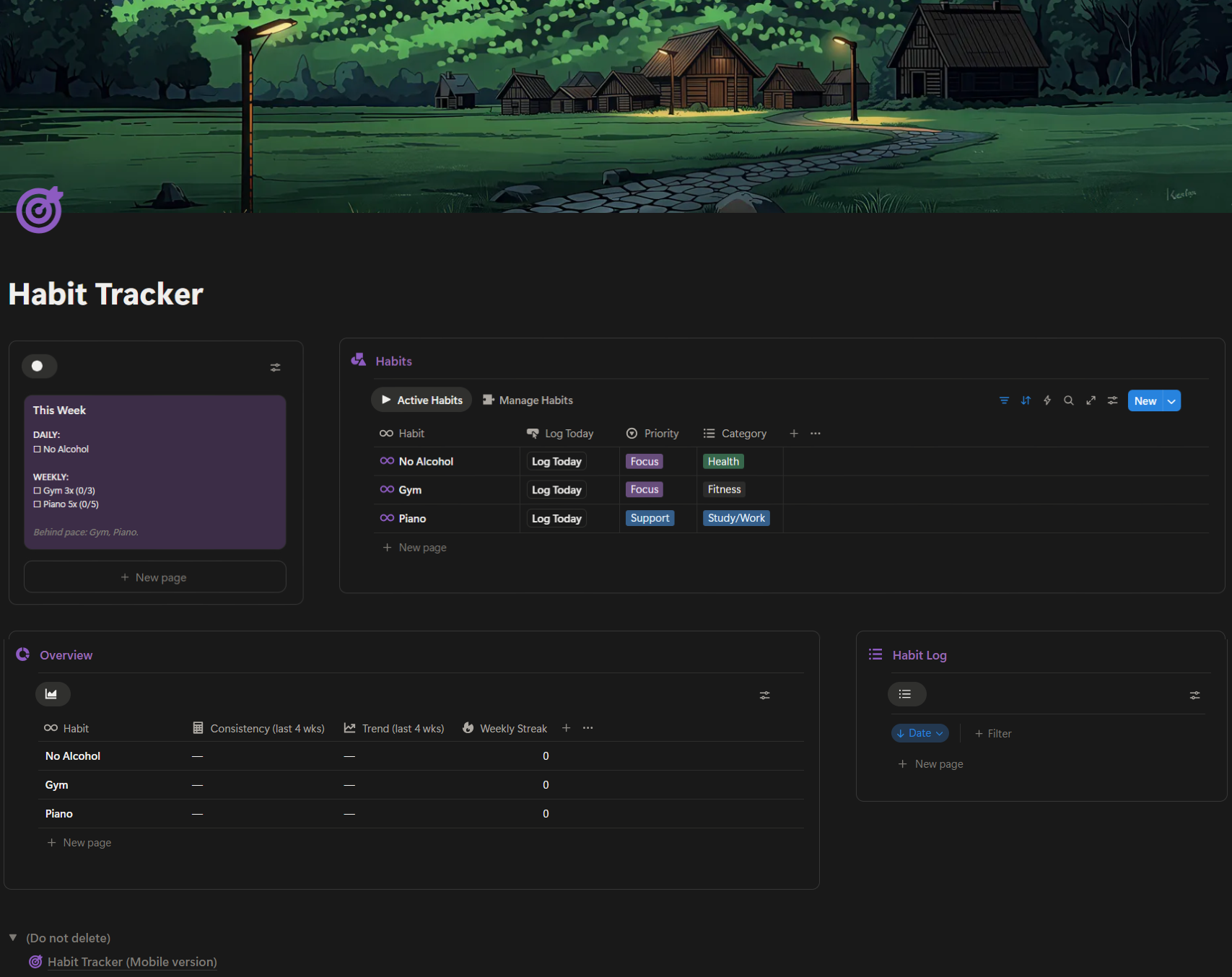 This is a focused Notion habit tracker built around weekly progress, not daily perfection.